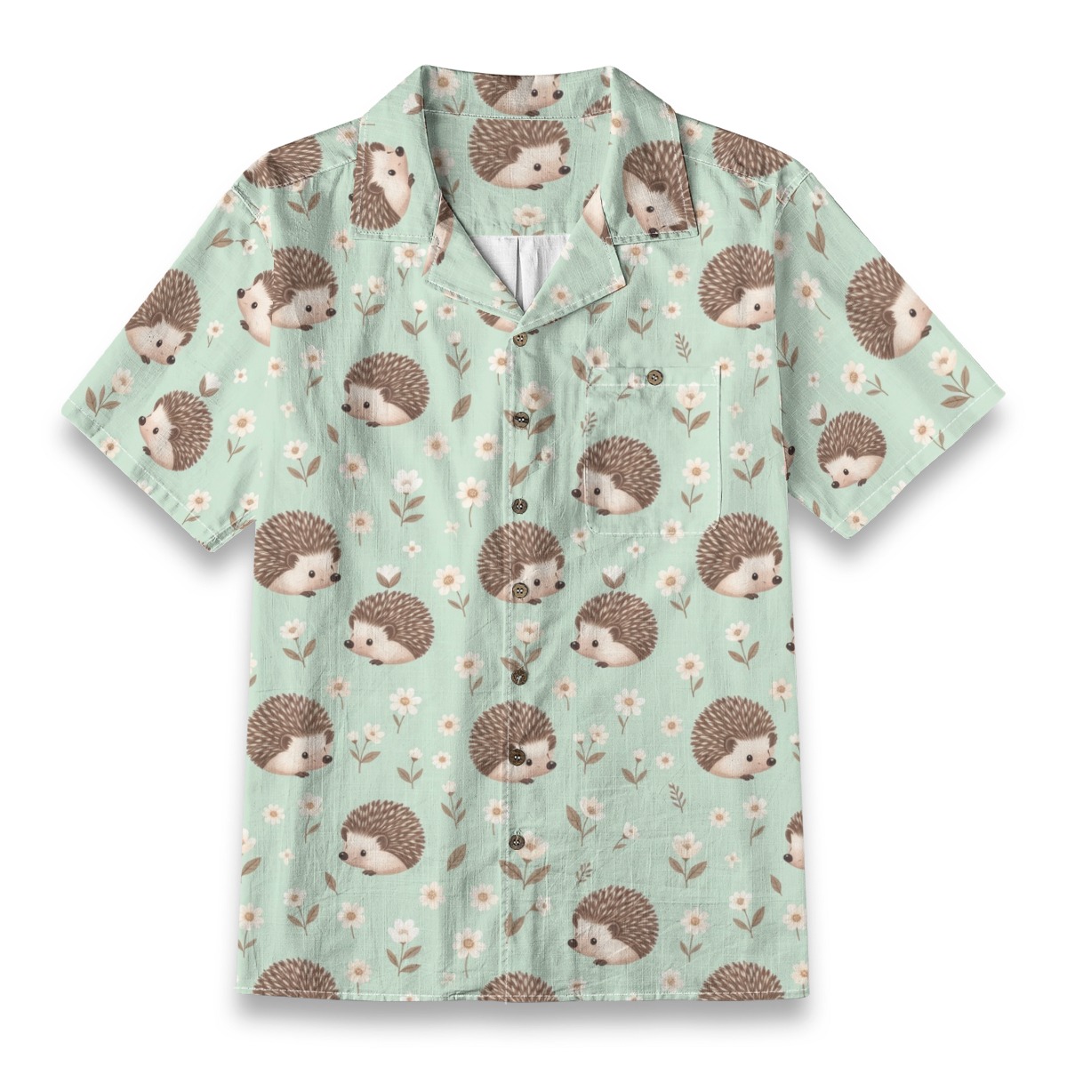 Tiny hedgehogs nestled among delicate florals create a soft, charming pattern full of warmth. The pastel mint background enhances the gentle color palette, making the design feel fresh and light. Evenly spaced motifs give a comforting rhythm, blending cuteness with a subtle tropical breeze.