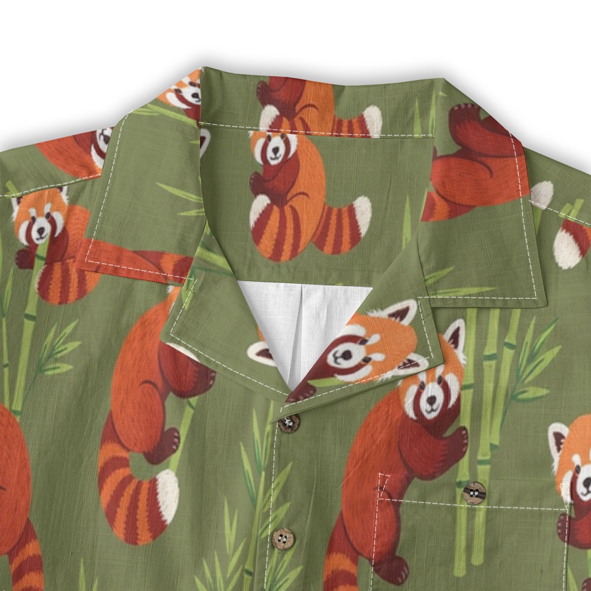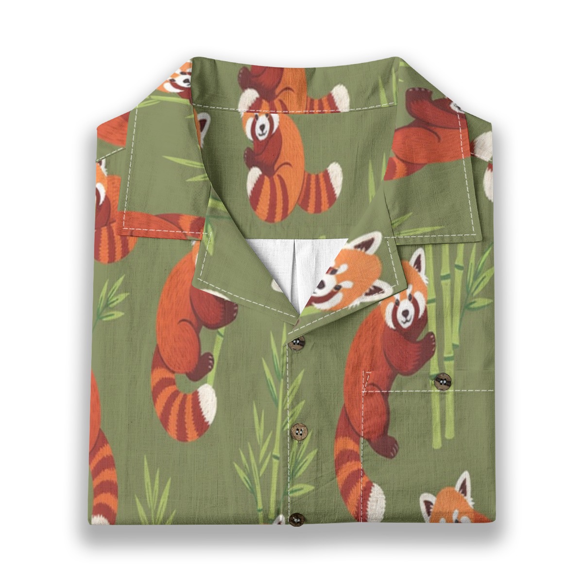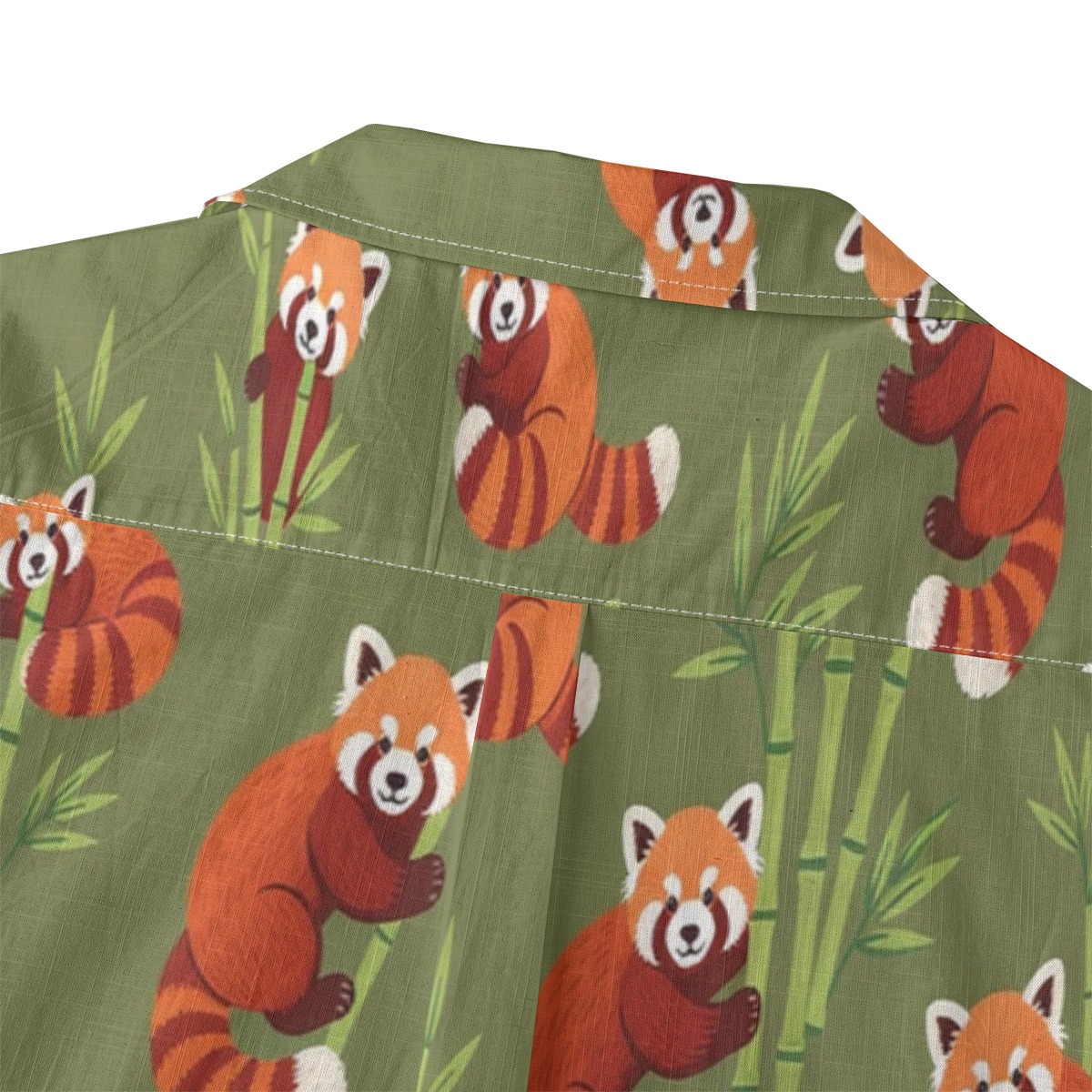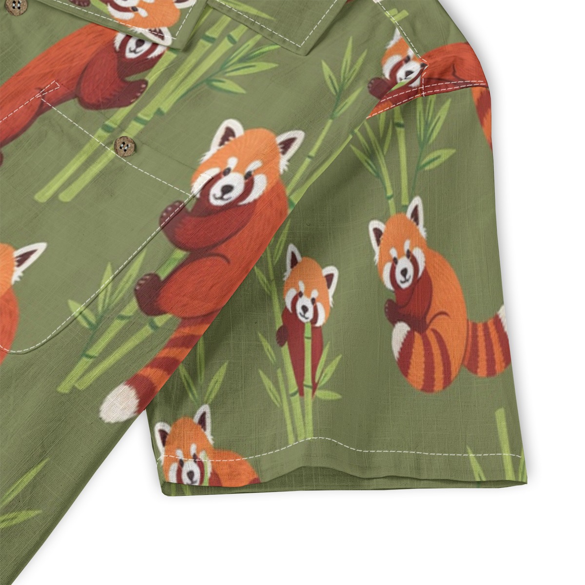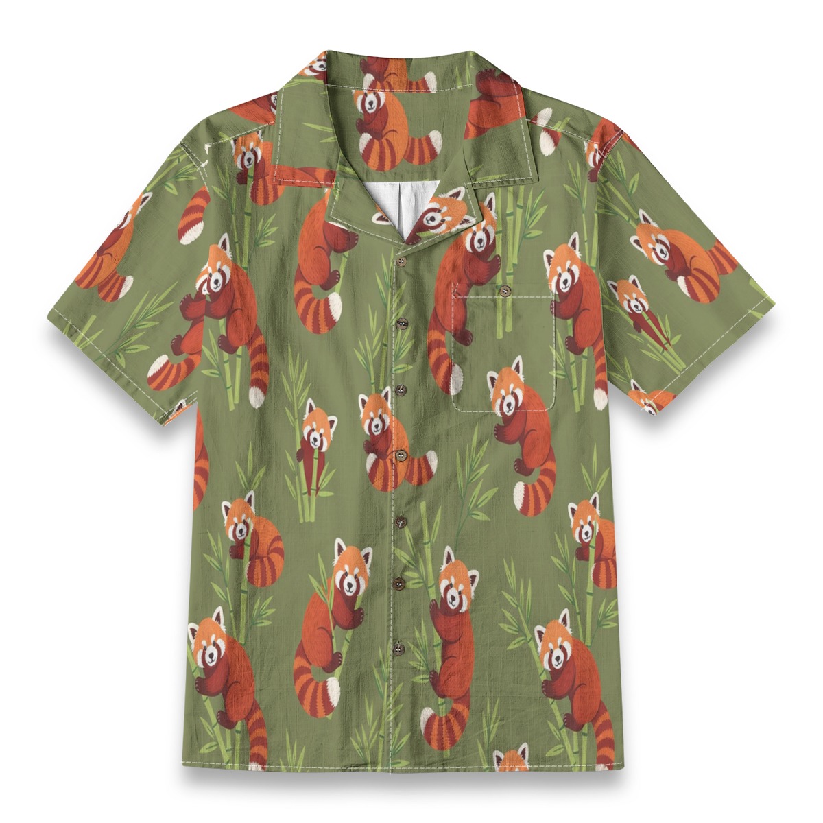 Playful red pandas weave through bamboo accents in a lively yet harmonious pattern. Warm orange tones pop against the earthy olive backdrop, creating a cozy tropical feel. The evenly spaced design keeps movement flowing, giving the shirt a balanced and inviting visual rhythm.