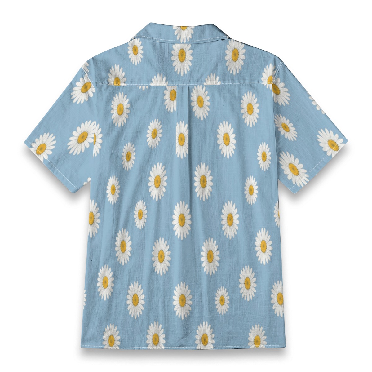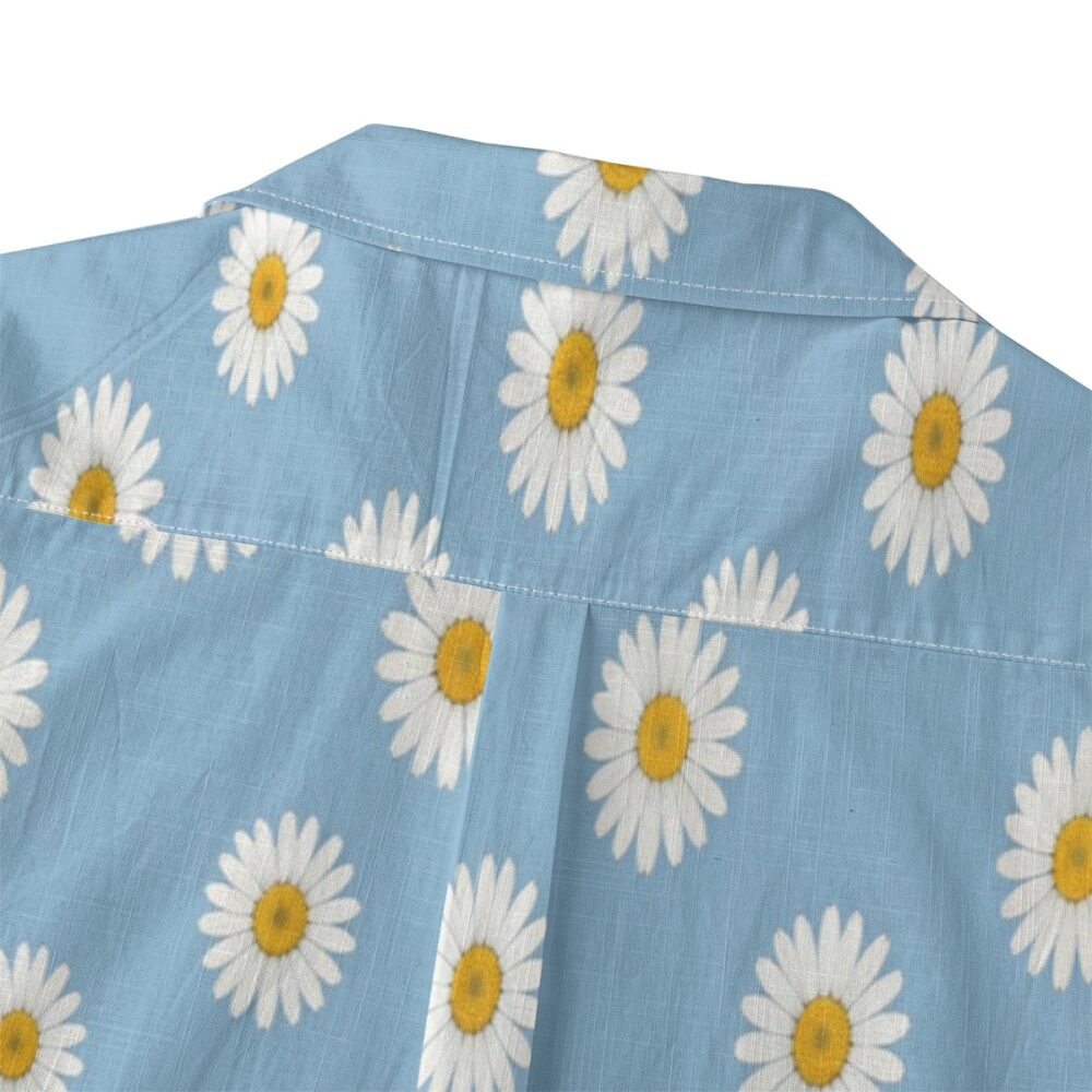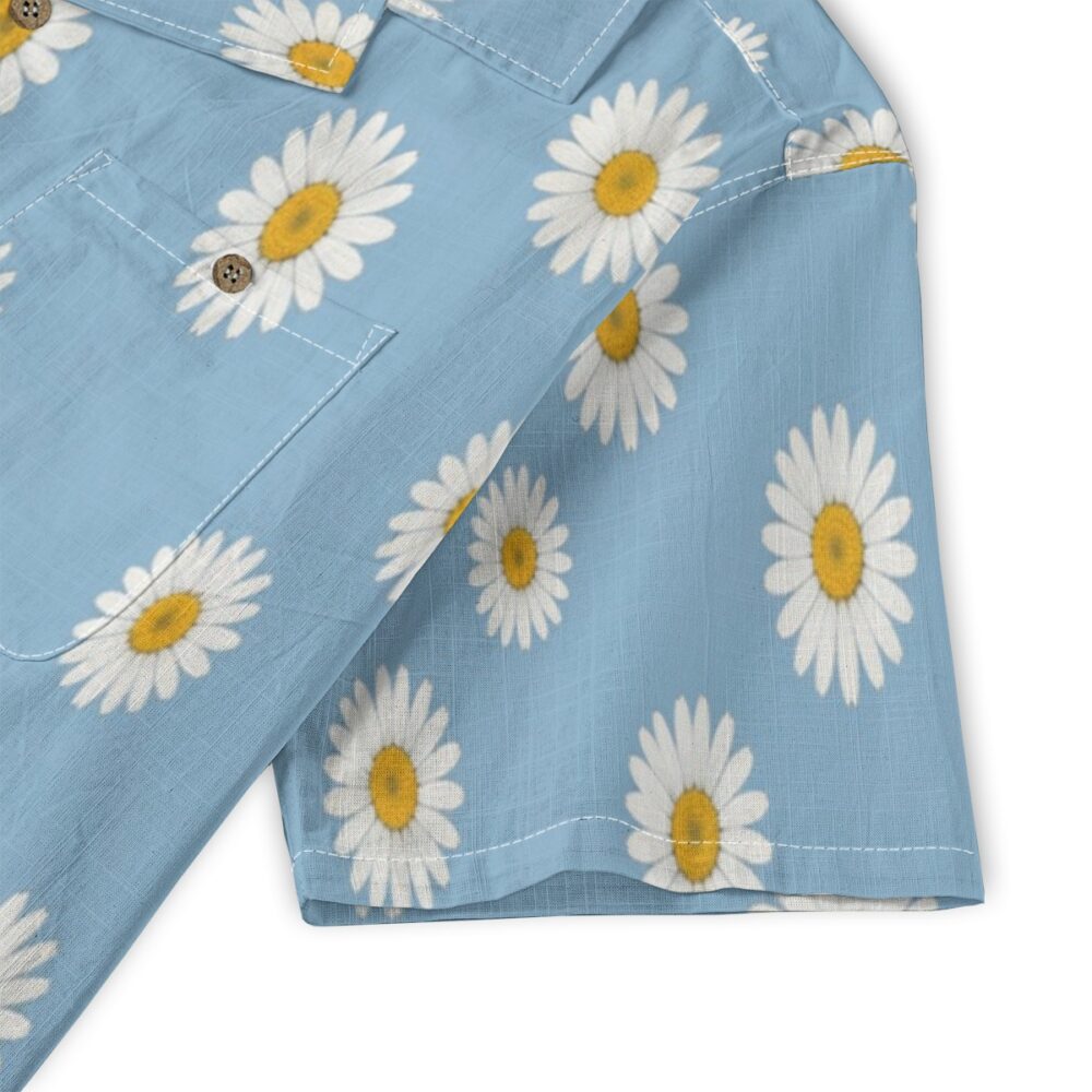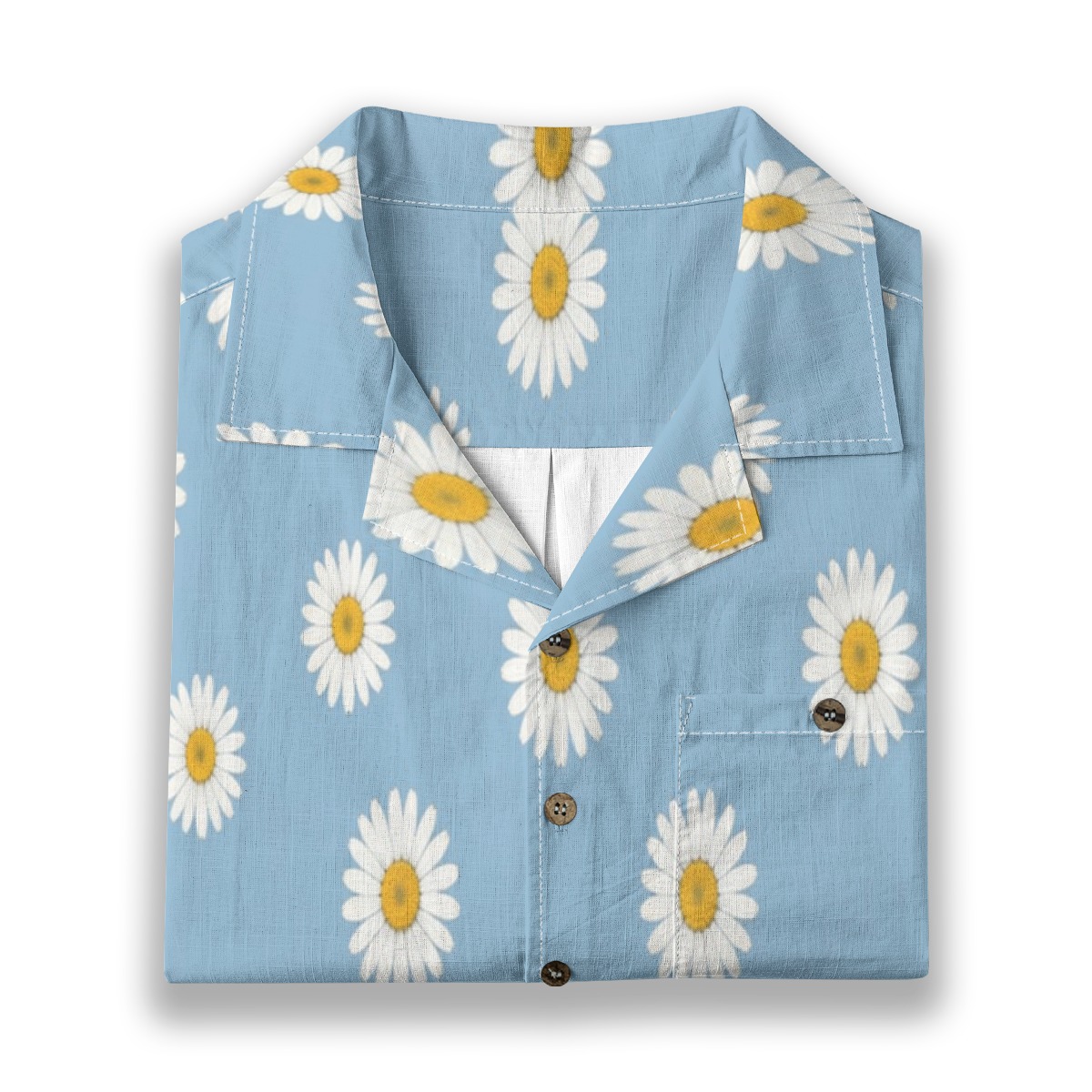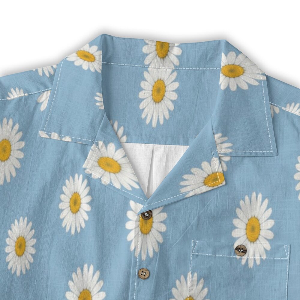 Bright daisies drift across a soft sky blue backdrop, creating a cheerful and breezy floral pattern. The white petals and golden centers bring a light, sunlit energy that feels effortlessly uplifting. Even spacing keeps the design balanced, making it perfect for a relaxed and joyful tropical mood.
