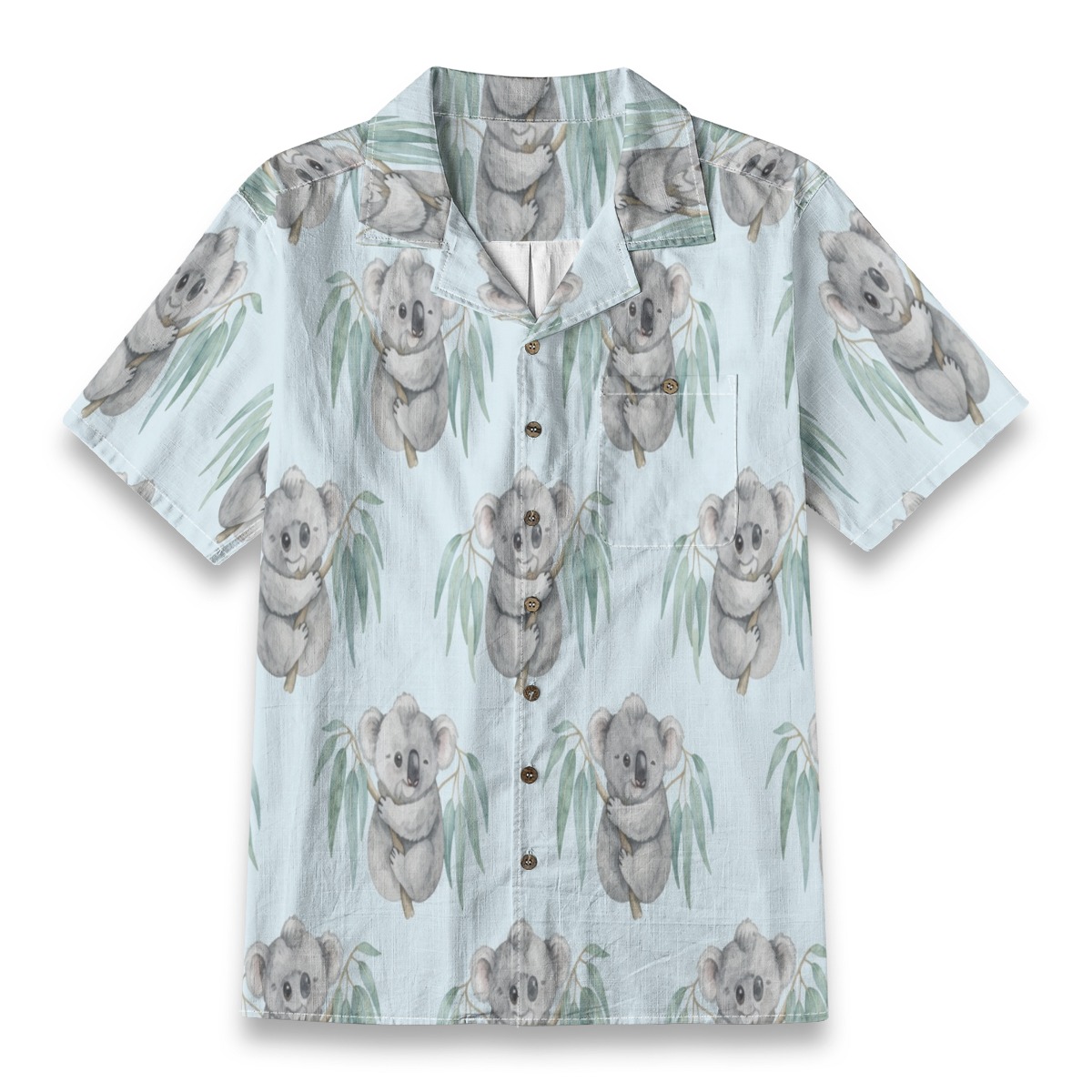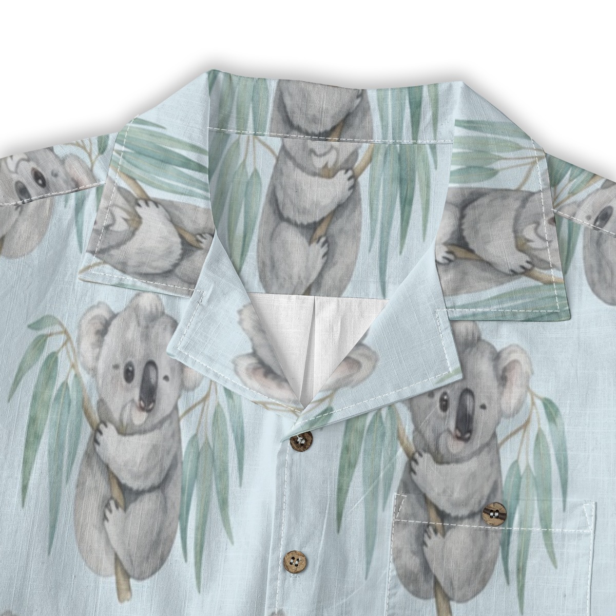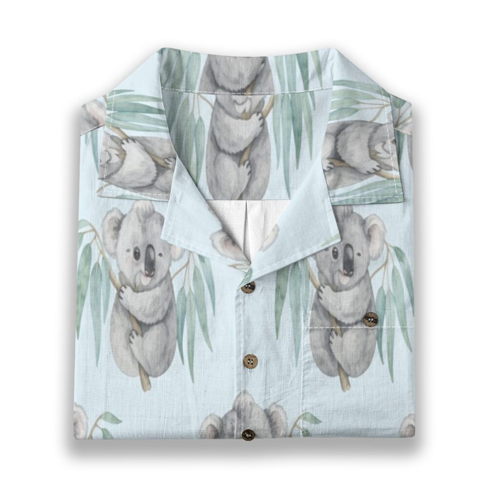 Calm koalas cling to drifting eucalyptus branches in a soothing watercolor pattern. Soft blues and muted greens create a tranquil, breezy feeling that flows effortlessly. The balanced layout keeps the design airy and serene, capturing a peaceful island mood with a gentle touch of nature.