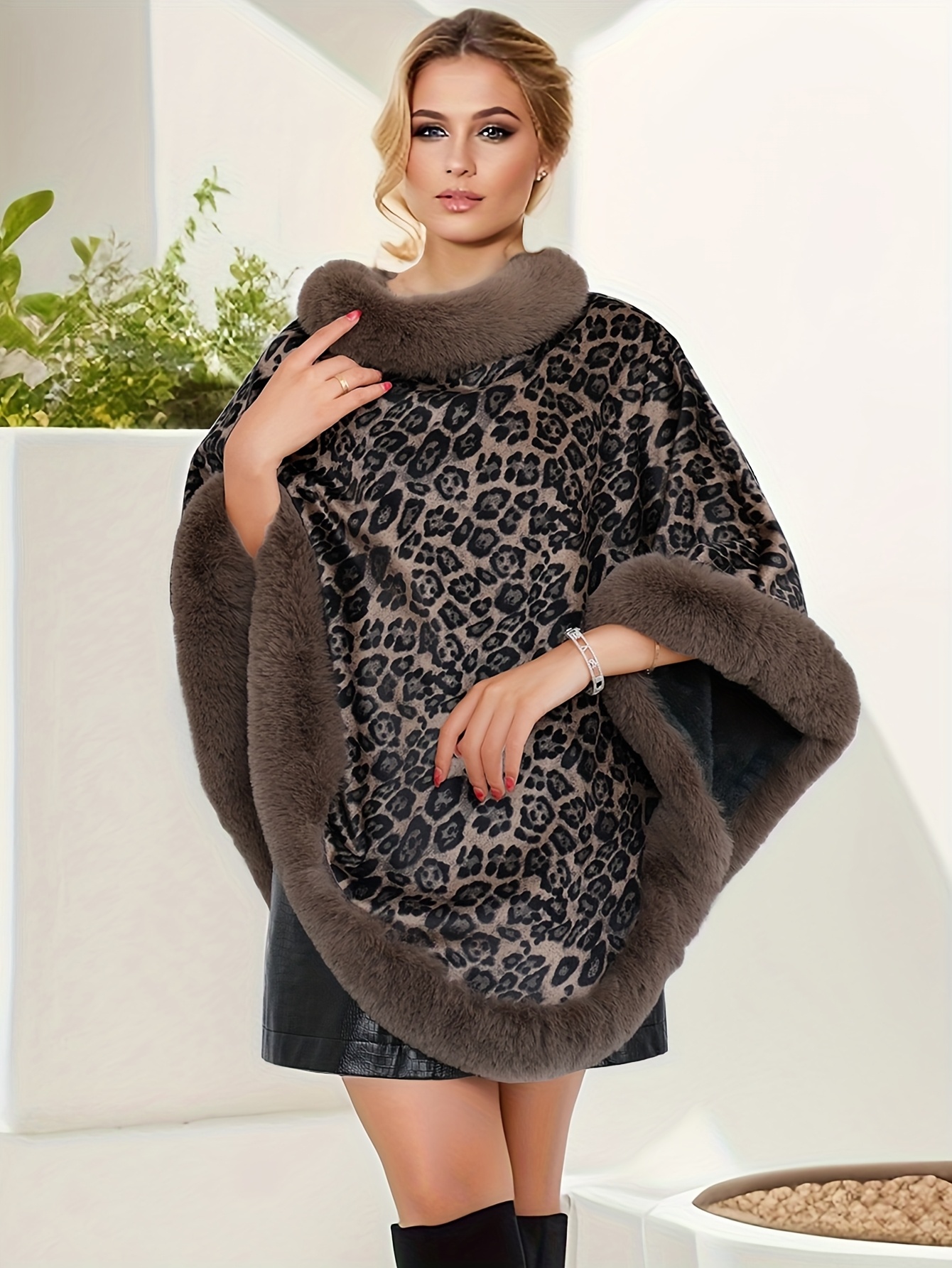 Introducing our Women’s Leopard Print Faux Fur Cloak Coat – Elegant Thermal Winter Poncho