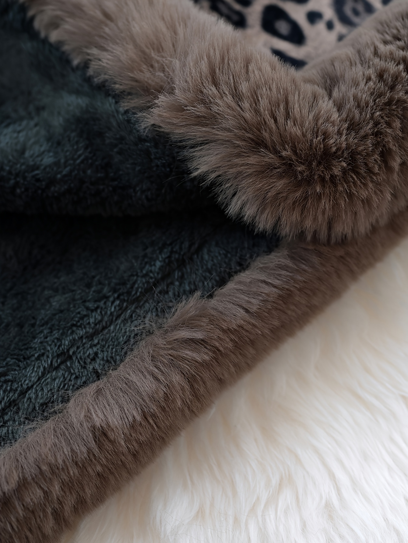 Leopard print: tawny-brown base with black and dark brown rosettes and spots, finished with a wide, plush mocha faux-fur trim around the collar and edges.